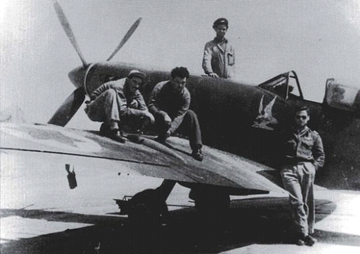 Na obrázku je Dani Shapira opřený o Spitfire „bílá 26“, na letišti Azion air strip, severně od pouště Negevu, rok 1949.