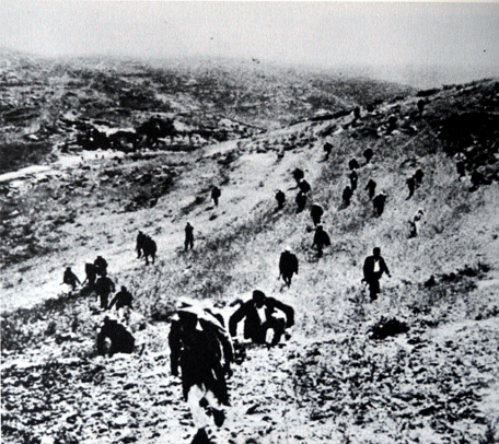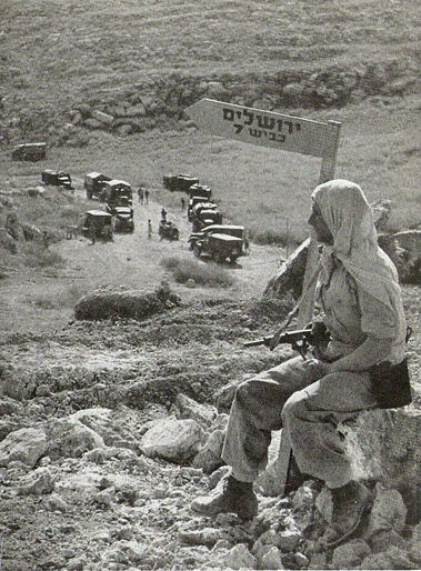 Fotografie ukazující postup izraelské pěchoty v rámci operace Nachšon, vojáci postupují na vesnici al-Kastal.