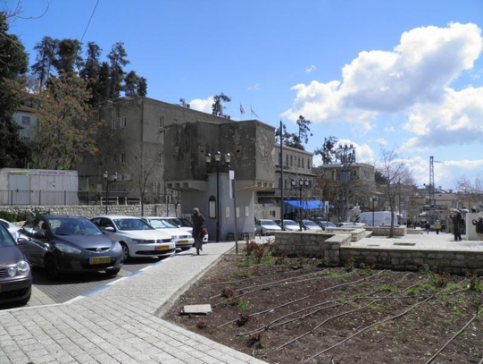 Safedské náměstí s bývalou policejní stanicí, malou ,ale velmi odolnou, britskou pevnůstkou a jak jinak, dělem Davidka.