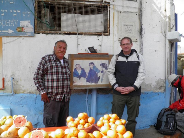 Je to taková zajímavost. Je na ní moje maličkost a osobní řidič Ariela Šarona, bývalého izraelského premiéra. Nyní si vydělává jako prodejce čerstvých ovocných šťav – neskutečně dobrýcha a stejně tak skutečně dost drahých. Tedy na naše poměry. Je to taková místní celebrita a dokonale toho využívá – chová se jako dokonalý model. Přitom je to bývalý statečný voják a loajální člen Šaronova týmu.