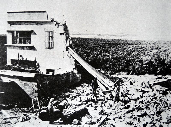 Petah Tikva v době zbudování, asi rok 1905. Druhý – níže – obrázek ukazuje stav Petah Tikvy po válce za nezávislost