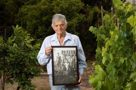 Israel Milrod drží fotografii Mordechaje Meltzera, vlevo, a jeho rodinných příslušníků. Credit: Moti Milrod