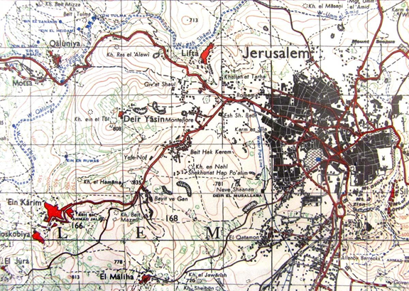 Dobová mapa ukazující polohu vesnice Dejr Jásin vůči Jeruzalému, na ploše Jeruzalém je vidět i Staré Město