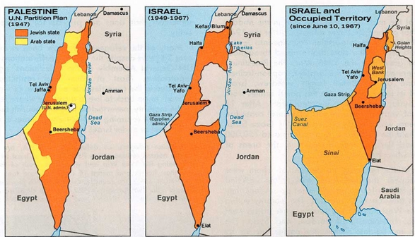 Zde je vidět mapový vývoj situace. Úplně vlevo je jak mělo vypadat rozdělení Palestiny mezi dva státy. Úplně vpravo je stav po šestidenní válce. A uprostřed je stav po výše popsané sérii jednání a uzavřených příměří. Zde je třeba říci, že o hranici se jedná pouze u Libanonu a Sýrie, u Sýrie s jistým podprahovým uvědoměním si, že to nebylo na 100%. U Jordánska šlo nikoliv o hranice, ale pouze a jen o linii příměří, na rozdíl od stupidních řečí dnešního OSN, EU, aktivistů všeho druhu a bohužel i palestinských Arabů. To samé plati i pro Pásmo Gazy, které udržel Egypt.