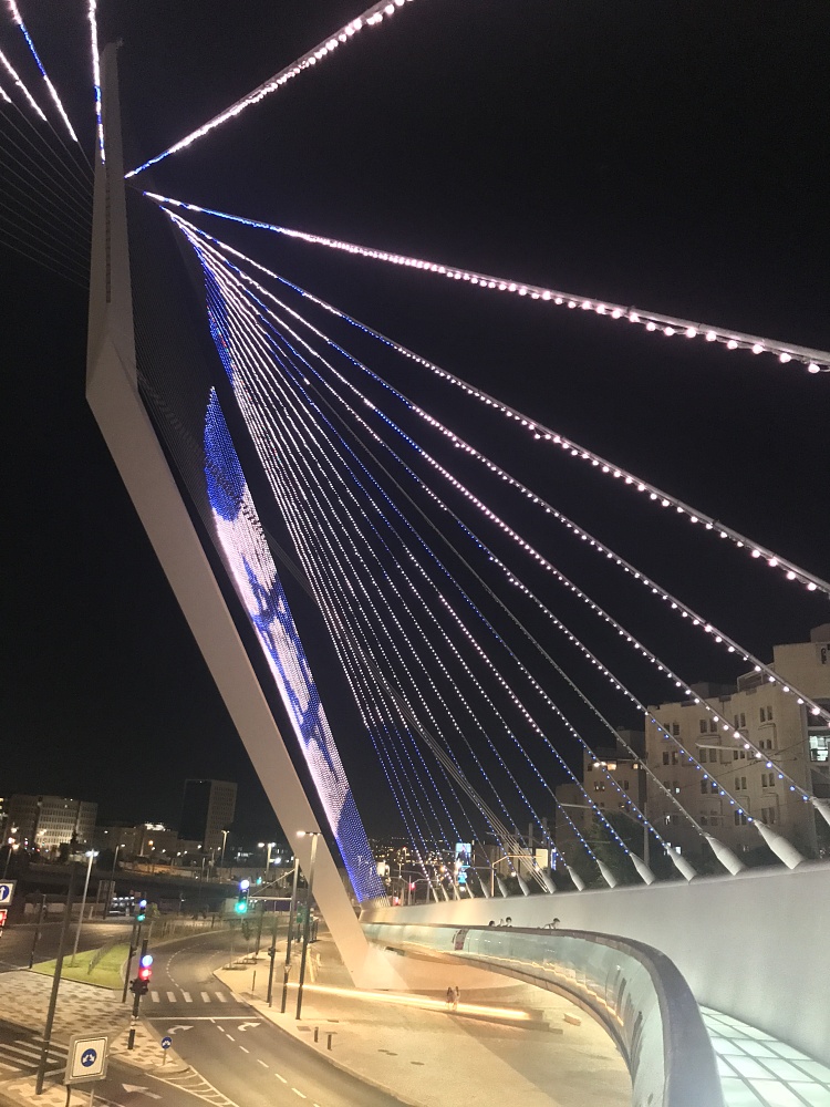 Přecházíme most a říkáme si, kohopak dnes večer v Jeruzalémě ještě potkáme? V tom pod Liduščinýma nohama cosi zapraská. Zvuk tříštícího se skla. Zvuk krajně nepříjemný, zvláště když si uvědomíme, že jdeme v zhruba čtyřmetrové výšce po podsvíceném mostním chodníku, který je ze skla. Tedy ze skla a oceli. Ale to sklo vážně praská. Tak jdeme raději po té ocelové konstrukci. Běžící děti naproti to však neřeší a běží hlava nehlava, sklo nesklo. Pak zjišťujeme, že jsou mnohé ty skleněné panely pod našima nohama roztříštěné, ale nevysypané. Zřejmě je pohromadě drží dostatečně silná bezpečnostní folie.
